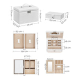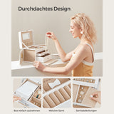Denne smykkeskrin er udstyret med mange kurser til forskellige juveler og sikrer, at dine armbånd, ringe, øreringe, kæder osv. Bagges sikkert. Den bløde fløjlsforing beskytter dine smykker mod ridser og anden skade.