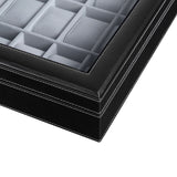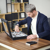 Tämä käytännöllinen kellalaatikko, jossa on tyylikäs muotoilu, suojaa kellokokoelmasi kankaalta ja naarmuilta. Tila 24 rannekellolle lasikansi esittelyä varten. Varustettu napsautusslokilla. 24 kappaletta irrotettavaa veluuriatyynyä