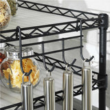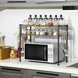 Sidinen keittiöpöytä: Käytä pystysuuntaista tilaa optimaalisesti tällä mikroaaltotelineellä ja tuo keittiöpöytä muotoon. 2 korkeuden säädettävät hyllyt tarjoavat kätevän paikan yrttipullojen säilyttämiseen, kun taas mikroaaltouuni voidaan sijoittaa vakaasti alaosaan. Spatulat ja pannut voidaan ripustaa koukkuihin. Mikä siisti keittiö!
