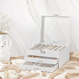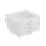 • Vad du får: En smyckeslåda med 23,2 x 20,5 x 14 cm i vitt, ett glaslock för enkel översikt, ett lås (nycklar ingår) och flera ämnen för klockor, manschettknappar etc.